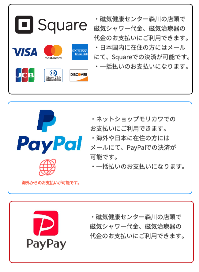 磁気健康センター森川へご来店の際に磁気シャワー、交流磁気治療器のご購入のお支払いにご利用ができます。